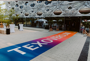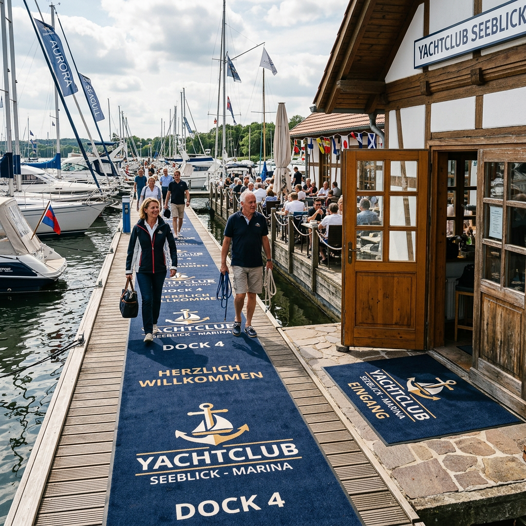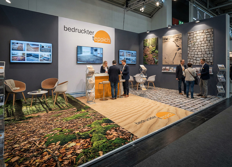 Böden kommunizieren. Im Messestand, auf der Bühne, im Hotelfoyer oder vor der Kamera: Der Boden ist das erste, was Besucher betreten – und das letzte, was sie bewusst wahrnehmen. Bedruckter-teppich druckt Teppiche, PVC-Vinyl und Kunstrasen mit Ihrem Motiv, Logo oder Design – auf Maßkonfektion, in dokumentierter Druckqualität, brandschutzzertifiziert.